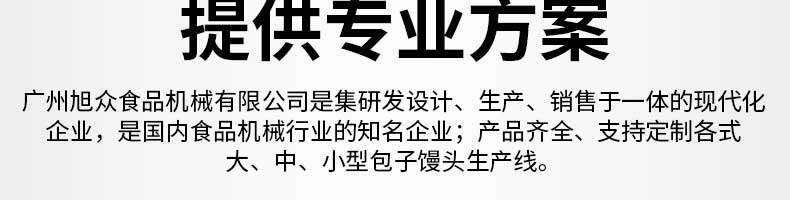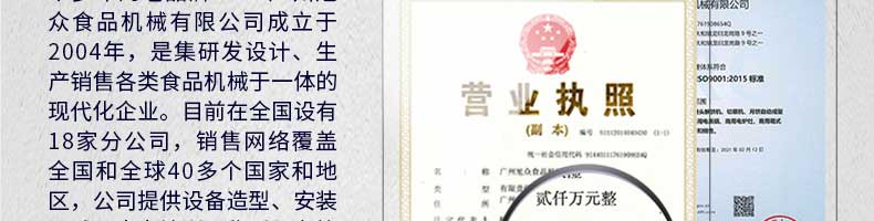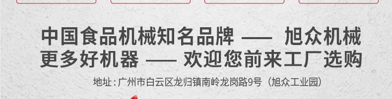 廣州旭眾食品機械有限公司是一家集科研開發(fā),生產設計,營銷服務為一體的現(xiàn)代化生產企業(yè)?,F(xiàn)代化生產車間,精湛制造技術,所產機械歷經市場重重考驗,不斷贏得海內外客戶的贊譽。