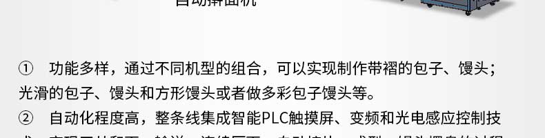 智能包子饅頭生產線,功能多樣,通過不同機型的組合,可以實現(xiàn)制作帶褶的包子、饅頭;光滑的包子、饅頭和方形饅頭或者做多彩包子饅頭等