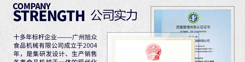 廣州旭眾食品機(jī)械有限公司是一家集科研開(kāi)發(fā),生產(chǎn)設(shè)計(jì),營(yíng)銷服務(wù)為一體的現(xiàn)代化生產(chǎn)企業(yè)。現(xiàn)代化生產(chǎn)車間,精湛制造技術(shù),所產(chǎn)機(jī)械歷經(jīng)市場(chǎng)重重考驗(yàn),不斷贏得海內(nèi)外客戶的贊譽(yù)。