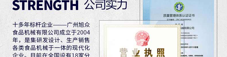 廣州旭眾食品機械有限公司是一家集科研開發(fā),生產設計,營銷服務為一體的現代化生產企業(yè)?,F代化生產車間,精湛制造技術,所產機械歷經市場重重考驗,不斷贏得海內外客戶的贊譽。