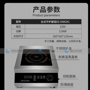 臺(tái)式平爐旋鈕XZ-DSK2X1,商用智能電磁爐3500W大火力、節(jié)能省電、聚能加熱。您需要一臺(tái)經(jīng)久耐用的好電磁爐不銹鋼材質(zhì)加厚不銹鋼架構(gòu),穩(wěn)定耐用,不易生銹,耐腐蝕,易清潔,干凈省事。