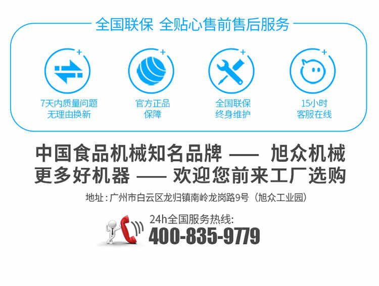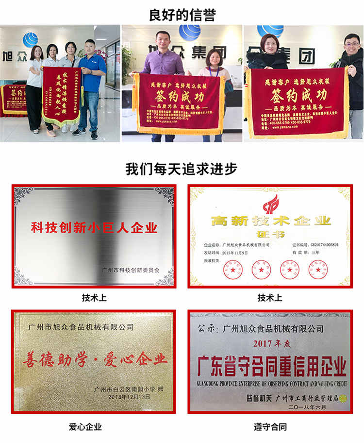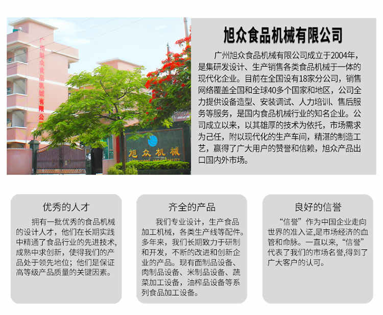 廣州旭眾食品機械有限公司是一家集科研開發(fā),生產(chǎn)設計,營銷服務為一體的現(xiàn)代化生產(chǎn)企業(yè)?,F(xiàn)代化生產(chǎn)車間,精湛制造技術,所產(chǎn)機械歷經(jīng)市場重重考驗,不斷贏得海內(nèi)外客戶的贊譽。