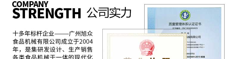 廣州旭眾食品機械有限公司是一家集科研開發(fā),生產(chǎn)設計,營銷服務為一體的現(xiàn)代化生產(chǎn)企業(yè)?,F(xiàn)代化生產(chǎn)車間,精湛制造技術(shù),所產(chǎn)機械歷經(jīng)市場重重考驗,不斷贏得海內(nèi)外客戶的贊譽。