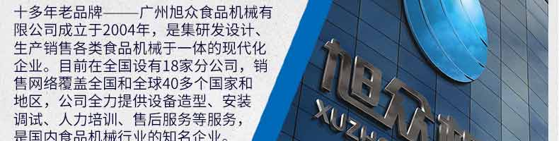 廣州旭眾食品機(jī)械有限公司是一家集科研開發(fā),生產(chǎn)設(shè)計(jì),營銷服務(wù)為一體的現(xiàn)代化生產(chǎn)企業(yè)。現(xiàn)代化生產(chǎn)車間,精湛制造技術(shù),所產(chǎn)機(jī)械歷經(jīng)市場(chǎng)重重考驗(yàn),不斷贏得海內(nèi)外客戶的贊譽(yù)。