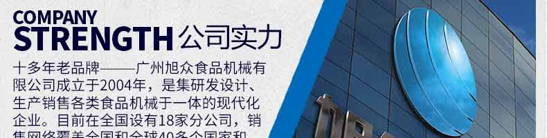廣州旭眾食品機械有限公司是一家集科研開發(fā),生產(chǎn)設計,營銷服務為一體的現(xiàn)代化生產(chǎn)企業(yè)?,F(xiàn)代化生產(chǎn)車間,精湛制造技術,所產(chǎn)機械歷經(jīng)市場重重考驗,不斷贏得海內外客戶的贊譽。