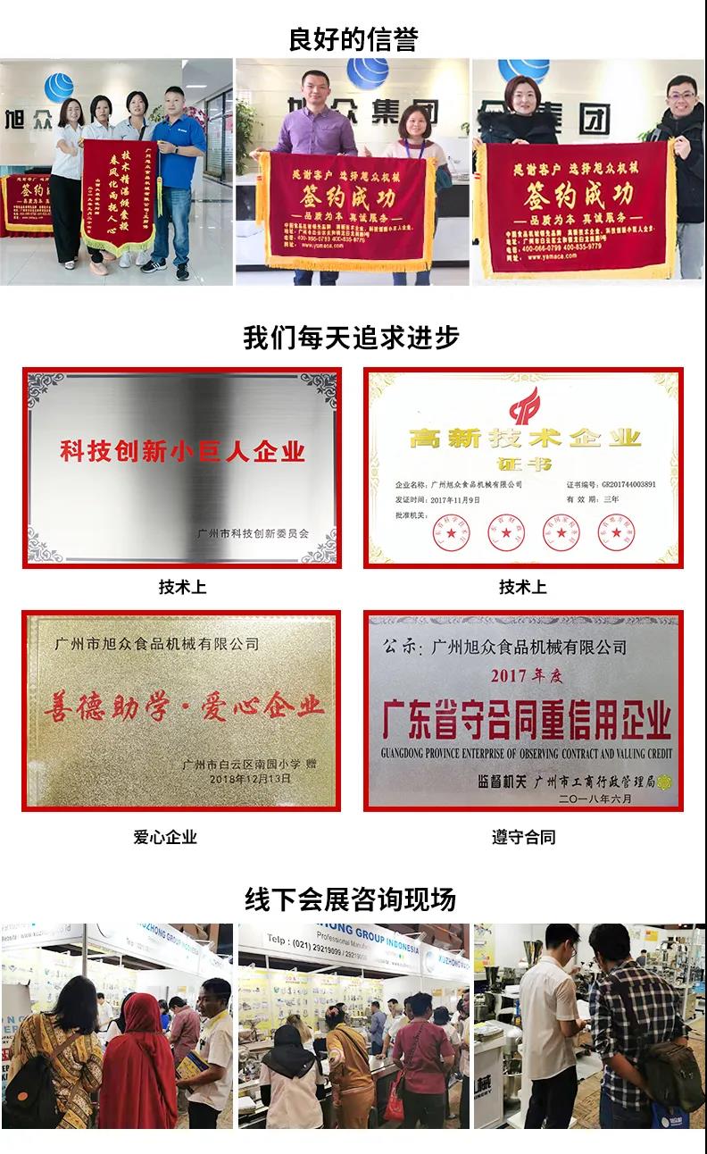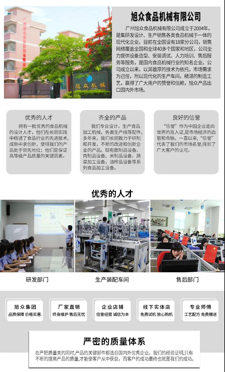 廣州旭眾食品機械有限公司是一家集科研開發(fā),生產(chǎn)設計,營銷服務為一體的現(xiàn)代化生產(chǎn)企業(yè)?,F(xiàn)代化生產(chǎn)車間,精湛制造技術,所產(chǎn)機械歷經(jīng)市場重重考驗,不斷贏得海內外客戶的贊譽。